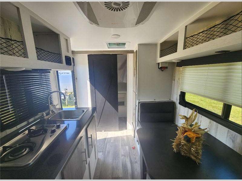The one piece seamless poured resin fiberglass roof goes from bumper to hitch for a better seal. They offer space-saving functionality with convertible beds and bathrooms with a shower. All Rove Lite models offer solid surface countertops and wood grain cabinetry in the kitchen, a foot flush toilet and fantastic vent, plus 13" custom light-weight aluminum wheels and an outside shower.