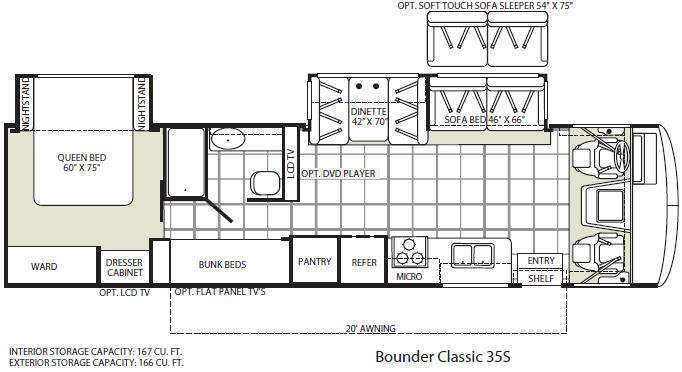 Features include: Double Slide Bounder Class Class A w/Rear Rear Queen Bed Slide Out & Nightstands, Ward., Dresser/Cabinet, Opt. LCD TV, Bunk Beds, Opt. Flat Panel TV's, Tub, Lav., Toilet, LCD TV w/Opt. DVD Player, Pantry, Refrig., 3 Burner Range w/Micro., Dbl. Kitchen Sink, Entry Shelf, Booth Dinette & Sofa Bed Slide Out or Opt. Soft Touch Sofa Sleeper, 20' Awning.