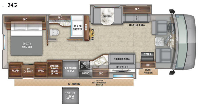 The whole gang will love traveling in this Vision XL Class A gas motorhome! With a tri-fold sofa, a theater sofa, and a booth dinette, everyone will have a comfortable place to sit and socialize together. You will find plenty of entertainment not only inside with the 50" TV on a lift and the fireplace, but also outside with the exterior entertainment center and the 23' electric awning with LED lights to keep you protected from the sun. The rear private bedroom is the perfect place for you to retreat to and enjoy an afternoon nap on the king-size bed or watch a quick episode of your favorite show on the 32" LED TV. Just outside the bedroom is a closet that is prepped for you to add the optional washer/dryer so that you can extend your vacation even longer with clean clothes!